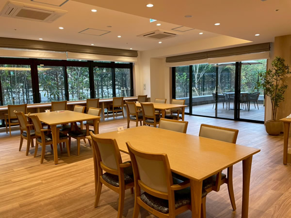 ホテルのような落ち着いた外観。心地よい居住空間で過ごすことができます。ホームではコンシェルジュが自由な暮らしをお手伝いします。また、一人一人に合ったリハビリプログラムを用意、介護スタッフは24時間常駐です。
