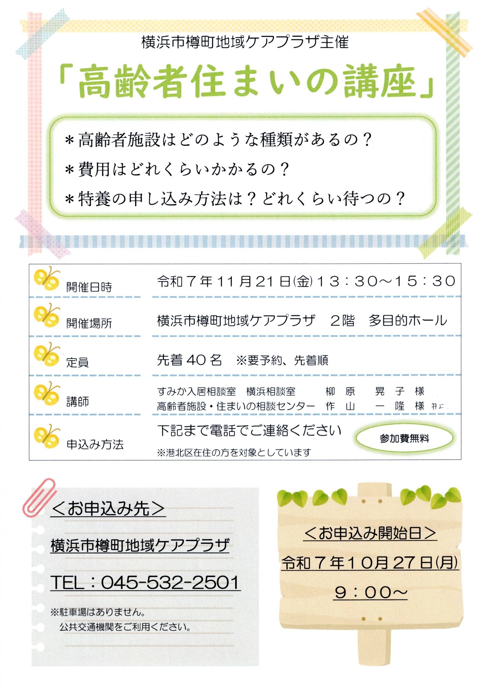 2025年11月に横浜市樽町地域ケアプラザで行われる「高齢者住まいの講座」のセミナーを横浜相談室の柳原晃子が担当いたします。